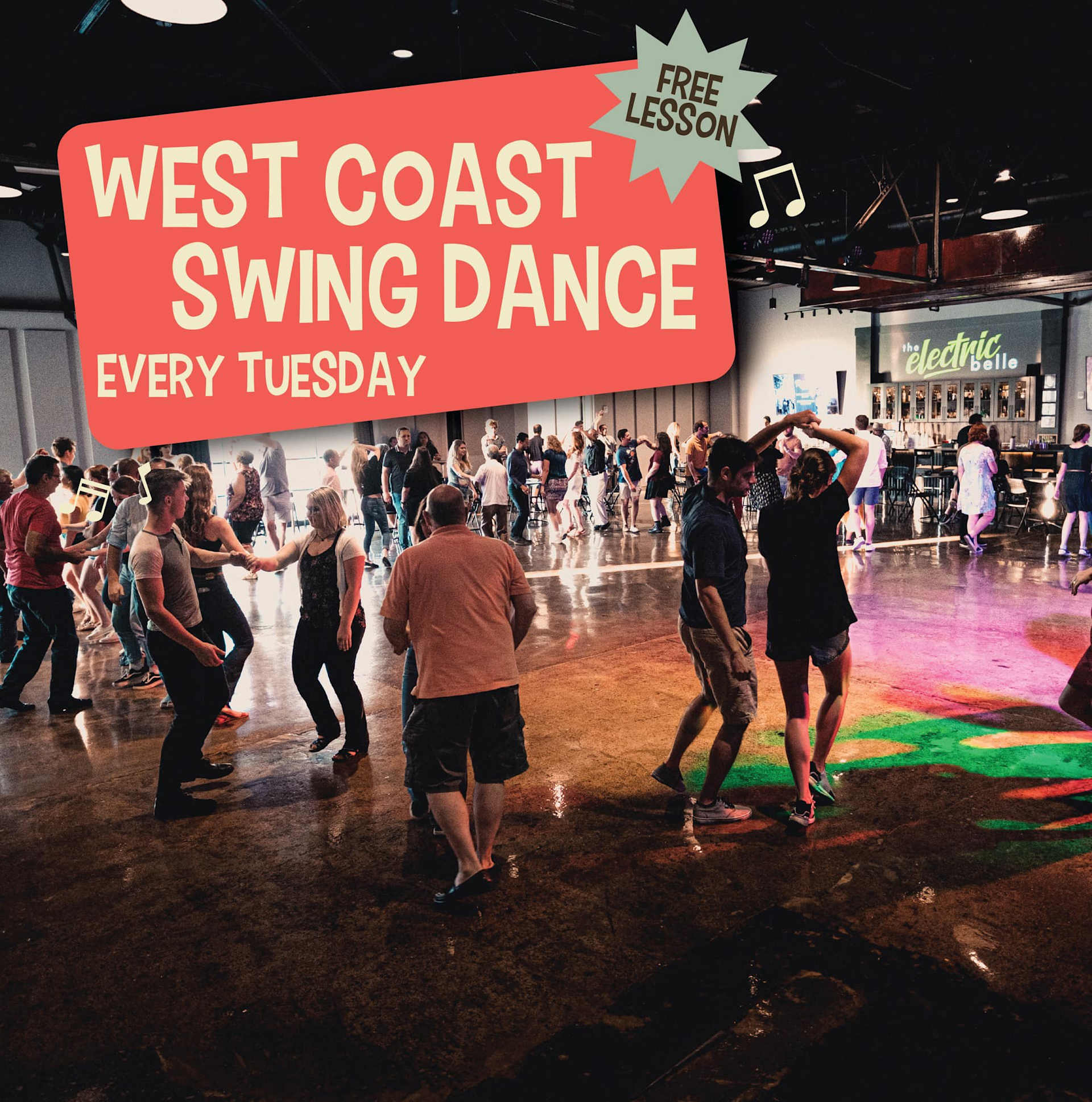 Join the Rocket Westies in The Electric Belle at Stovehouse every Tuesday at 6:30 pm for a FREE West Coast Swing Dancing Class, followed by open dancing until 10 pm!